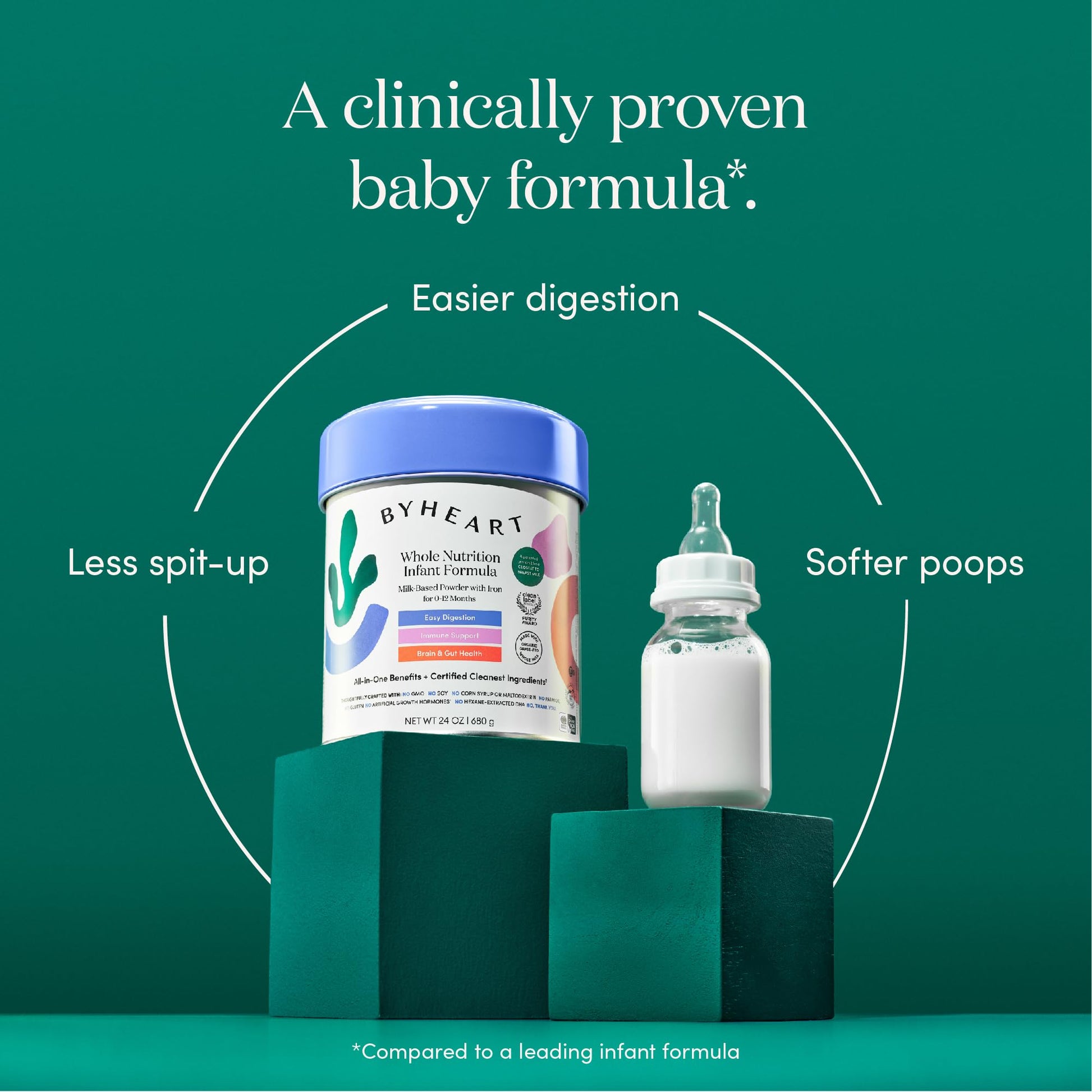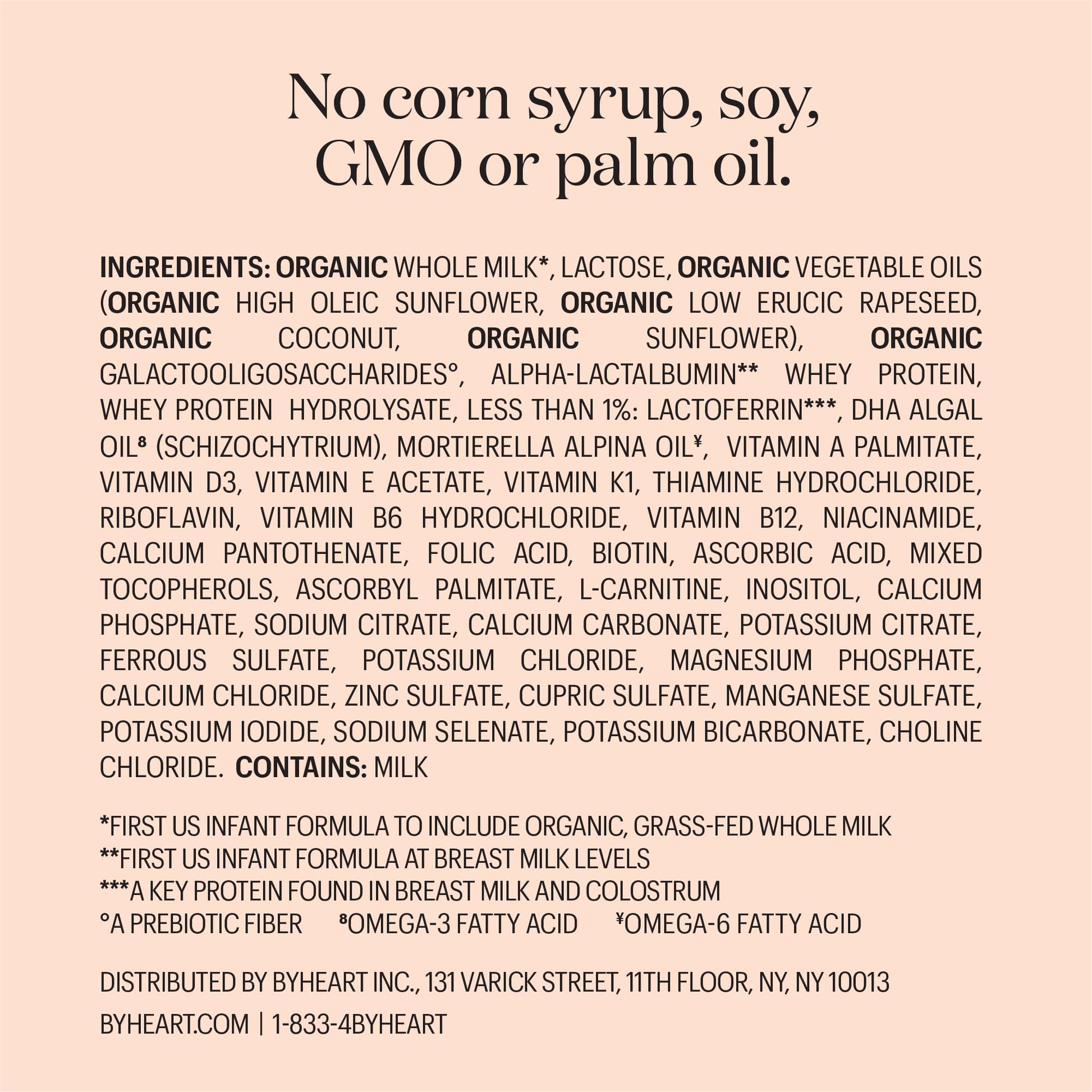 Details: ByHeart Whole Nutrition Infant Formula is designed for babies 0-12 months old. Our infant nutrition company was built from the ground up to deliver real innovation on behalf of babies and parents. Our mission is simple: make the best formula in the world. That's why we studied the latest breast milk science, worked directly with suppliers we know and trust, set uncompromising quality standards, developed our own small batch blending process, built our own manufacturing facilities, and conducted a groundbreaking clinical trial. We’re proud to be the infant formula made with only organic, grass-fed whole milk, not skim, with a patented protein blend that gets closest to breast milk. We’re also the first infant formula company to receive Clean Label Project's highest-tier Purity Award, and our formula is made with globally sourced ingredients in our own factories in Iowa, Oregon, and Pennsylvania. Our goal is to create a future where all parents feel amazing about feeding their baby—no matter how they do it.